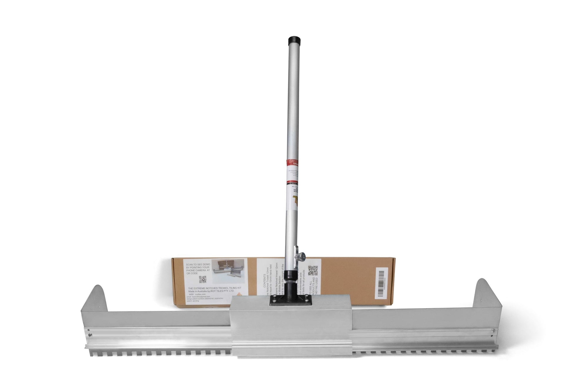 THIS IS THE SMALL ULTIMATE NOTCHED TROWEL -- A 12MM SQUARE NOTCHED TROWEL THAT CAN BE EXPANDED FROM 300MM TO 500MM. IT IS USABLE BY HAND BUT FAR MORE EFFECTIVE WHEN USED WITH THE HANDLE ATTACHMENT